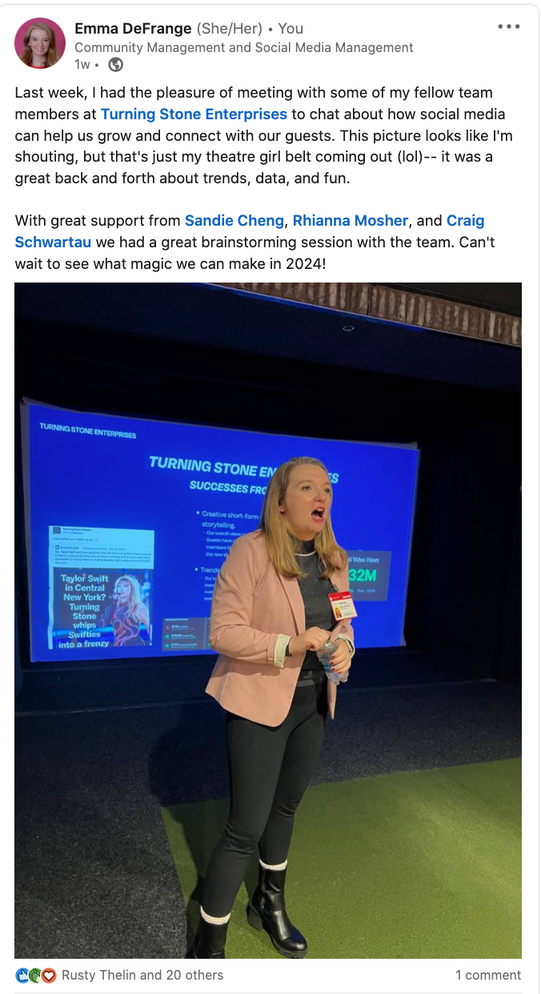 I have seen significant increase in engagement with showcasing team members, audiences feel that it shows a sense of authenticity and highlights the fun the team has at work.